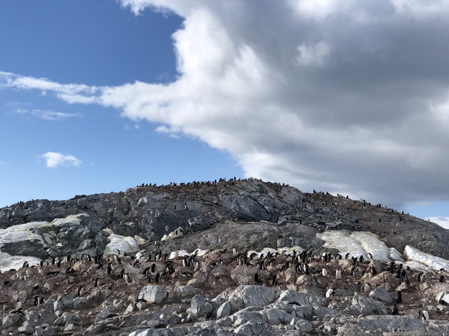 在附近的山丘和海滩上,目之所及皆是企鹅,漫山遍野估计得有几百上千只,虽然数量多的令人惊叹,但相比海滩上零星几只企鹅的憨态可掬,这里略显吵闹,有时候少数也许是一种优势,于是我又折回海滩,加入到蹲守小企鹅的行列中。