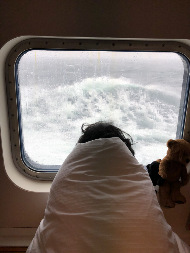 南美洲是距离南极洲最近的大陆,历尽千辛到达了南美洲的最南端后,想要到达南极大陆还需要跨越最后也是最艰难的一道坎-魔鬼德雷克海峡。900公里的宽度伴随着汹涌的海浪与狂暴的西风,轮船需要两天一夜的时间才能穿越。作为船上不晕船的少数派,我还尝试着走到舱外的甲板上,打算绕船一周,最终生怕被吹下去的我只走了不到一半的距离就撤回来了,在大自然面前,人类真的是无比渺小。