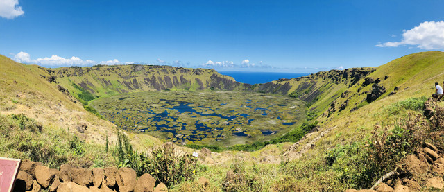 拉诺廓火山是复活节岛上著名的景点之一,站在火山口上俯视下面的火山湖,而旁边就是大海,景色非常美。不远处就是岛上的一处文明遗迹-鸟人村,这是原住民-波利尼西亚人曾经居住的地方,也是岛上仅有的两个凭票只能去一次的地方之一。沿着路线上山后,会看到一个小的停车的空地,那里是欣赏火山的一个地方,另一个地方就要进入鸟人村了,在进入鸟人村最深处的时候,也同时走到了火山口上,可以从另一个角度欣赏火山。