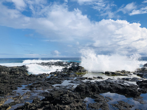 后来我们沿着海边慢慢的走,看到了奔跑的马儿与奶牛,没错,我是一个没见过世面的城里人,虽然我知道牛能跑,但印象中奔跑的牛应该是斗牛场的公牛、非洲或北美的野牛、青藏高原的牦牛,奶牛似乎都是不跑的,但这俩货居然在飞奔,还跳房子一般的跨过了一个石头,以致于我都没拍下它们,哈哈,还有白云、海浪、蓝天、彩虹以及遍布海滩的火山岩,一切的一切,无法言表,上帝打翻了调色板也不过如此吧。