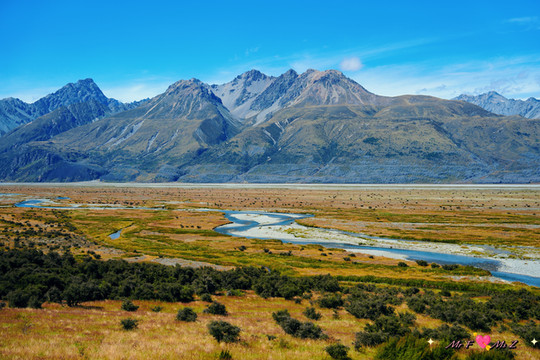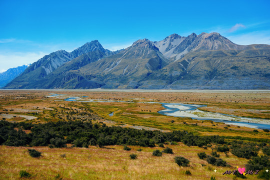 拉凯阿河(Rakaia River)从峡谷中奔流而过,在阳光的照射下,呈现出迷人的蓝绿色,宛如一条镶嵌在河谷中的蓝丝带,与周围的岩石和植被形成鲜明的对比。