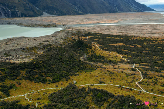 这条步道如同一段穿越时空的旅程:起初,它蜿蜒穿过一片静谧的森林,树影婆娑;随后,小径缓缓攀升,延伸至历史悠久、两侧荆豆丛生的摆渡者小道(Ferryman’s Track),两旁是冰川与河流冲刷而成的梯田。