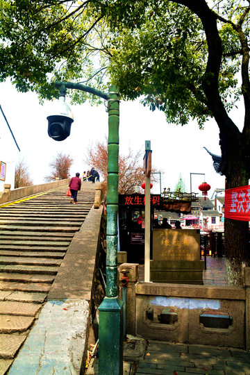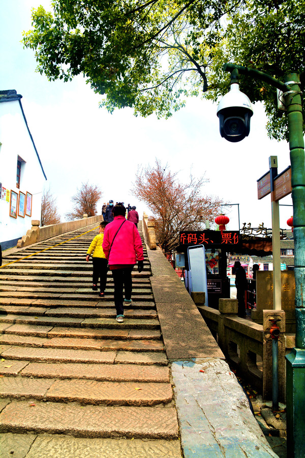 下面照片是泰安桥。俗称何家桥,始建于明代万历十二年(1584年),为单孔拱形石桥,是全镇最陡的一座石拱桥。桥堍竖立旗竿石两块,系悬路灯所用,是往来船只的航标。用于建造何家桥的材料是青石,且雕刻的桥栏浮雕“飞云石”,都酷似元代之作,桥前圆津禅院也建于元代,故对此桥的历史,造桥专家们有不同的看法。清代名士曾有诗:“日落炎威退,池塘淡月中;踏歌闻市上,渔笛在溪东,蒲扇轻摇暑,蕉衫短受风;晚凉闲独步,古寺一桥通”。诗中描写日落黄昏,渔歌唱晚,经过一天酷暑,人们轻摇蒲扇,步上桥头,尽情享受晚间清凉。真是一幅生动的古代消暑纳凉图。这里写了“古寺一桥通”,“古寺”即圆津禅院,“一桥”就是泰安桥了。