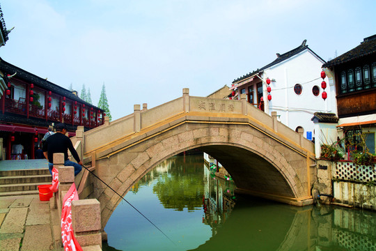 放生桥横跨于漕港河上,连结朱家角景区的南北两部分。是上海地区最长、最大、最高的五孔石拱桥,站在高高的桥拱顶端环望四周,欣赏白墙黑瓦的大片房屋、桥下往来的木船,古镇全貌尽收眼底,是取景摄影的绝佳之处。夕阳西下时,在桥上赏夕阳,或在河边拍摄夕阳下的放生桥,都很有意境。放生桥,顾名思义是鼓励人们行善积德。这座桥始建于明朝隆庆五年(1571年),由慈门寺的性潮和尚用自己十五年化缘得来的积蓄捐建了这座石拱桥,并且每逢农历初一、十五都会组织僧人和香客到桥下举行“水生动物”放生大会,这种习俗一直被传承至今。不过现在桥头常有兜售小鱼或和乌龟让游客去“体验”放生的商贩,显得很商业化。如今看到的放生桥是于清嘉庆十七年(1812年)重建而成。整座石桥气势雄伟,桥上有龙门石,镌盘龙八条,形象逼真。桥顶有四只仰头张嘴的迎客石狮,憨态可掬。中间有竹节望柱,桥面中央镶嵌雕花石板。桥东建有碑亭,逛累了可在此小憩,临水筑有石驳,为舟楫停泊所用。