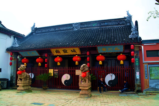 城隍庙是青浦城隍行宫,乾隆二十八年(1763年)徽州人程履吉谋迁今址。庙中间为头门、戏台、大殿,两侧为庑,旁有小曲溪,桃李杨柳随处可见,布局雅致,有12胜景。戏台的项部由160只斗拱组成圆旋形顶,十分罕见。两侧石柱上嵌有对联“筑斯台悠也久也,观往事梦耶真耶”,横额“承平雅颂”。1986年列为县级文物保护单位。城隍庙座东朝西,正门临河有一垛照墙,两边为东西辕门,正前有一对石狮,怀抱绣球,线条柔和。进门左右有两个侧殿,再前有一石柱鱼脊,飞檐翘角的戏台。戏台前是一块用石条铺就的庙场,过庙场便是正殿,殿正中供奉着城隍老爷与夫人的塑像,两人都慈眉善目,一脸的祥和。