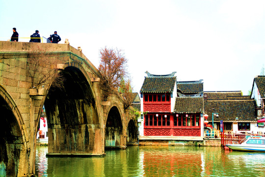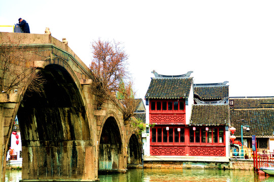 这是福星桥。建于清雍正二年(1774年),在镇的西市梢,古时水乡市梢大多没有木栅,为安全每到晚上关闭栅门,禁止外来船只通行,所以这里为瑚瑎港西栅口,故又称西栅桥,亦称西石桥。福星桥现保存完好,高大挺拔,桥面麻石斑驳,桥基石缝中伸出几株小树,又显现出几分秀丽和潇洒。两边桥楹柱上镌刻着:“潮涌越水飞龙卧,云接吴山挂月钩;一水锁住佳气绕,千年环见彩虹垂。”桥联有景、有情、有味,道出了三泖九峰边的水乡之雅趣幽情。这是一首优美的借景抒情诗,确切地描述了古镇地处吴越交界地理位置的重要以及水乡泽国的秀丽风光。登桥远眺,向东鸟瞰全镇,雄伟建筑鳞次栉比尽收眼底,向西遥望一片湖光水钯,令人心旷神怡,真是福星临门,鸿运高照之感。