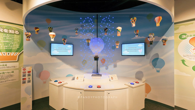 除了展出的各色气球外,博物馆也播放空中拍摄的高画质视频,来让游客体验乘坐热气球飞翔的感觉。另外像是游戏机般的模拟操作热气球,可以体验当一次热气球船长。又或是用动态模型来解说热气球升空的原理,每一种体验学习,都让我收获了更多与热气球有关的知识。据说只要通过博物馆内的五个知识点考验,还可以获得「热气球博士」的称号哦。