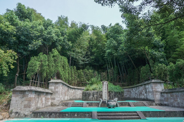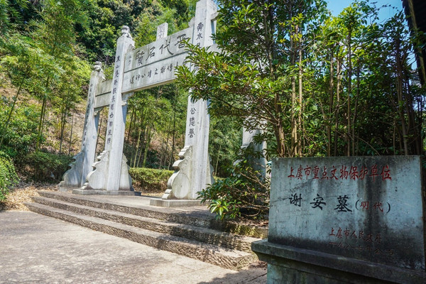 谢安墓居东山之巅,头枕峰峦,裣衽“始宁”。左列东岗,右屏西岭,负阴抱阳,藏风得水,乃一方福地。条石环砌的坟前,一方高过头顶的墓碑数百年栉风沐雨默默地挺立在这里。谢公墓刚刚于去年整修完工,墓庄严而肃穆,凸显出晋太傅的尊贵。墓地旁“始宁泉”三字清晰可辨,泉水碧绿似昔,四周古樟散发出幽远的香味,令人思绪万千。