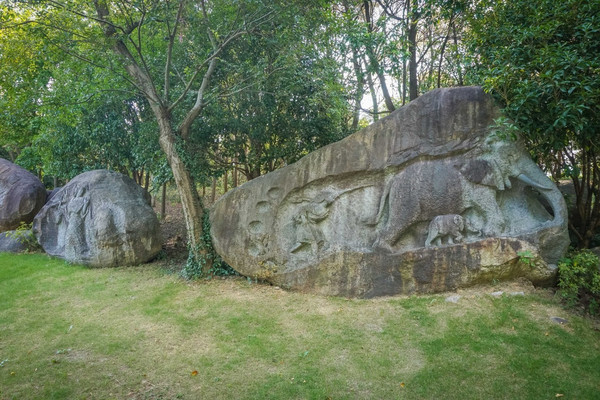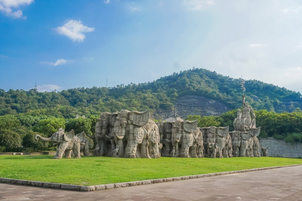 是大舜庙景区内的镇园之宝——舜耕群雕。它是以“象耕鸟耘”的典故为背景,由国际工艺美术大师韩美林设计制作的,是目前国内乃至亚洲最大的群雕石象。