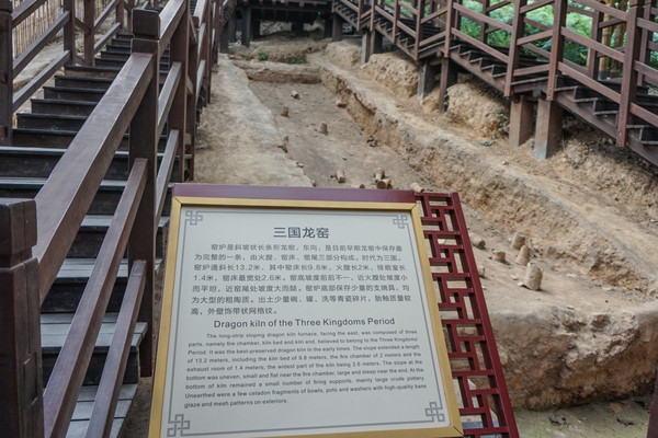 看到的这3条保存完整的龙窑,是2014年5—10月,由浙江省文物考古研究所联合上虞越窑青瓷发展研究中心开展考古发掘的成果,发掘面积800平方米,揭露了3条窑床,出土了大量高质量成熟青瓷器。(江南因为潮湿多雨,窑炉多依山坡而建,如龙似蛇故名龙窑),3条龙窑分别是东汉、三国和西晋时期的窑炉。均为斜坡状长条形龙窑(东汉长12.8米,三国长13.2米,西晋长14.2米)。还有现场也展示了一部分考古发掘出土的器物。