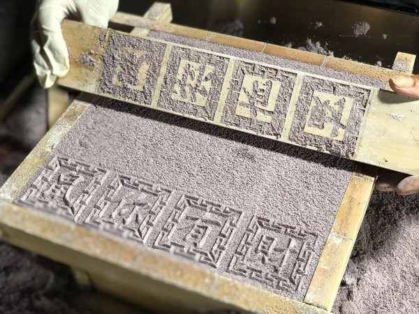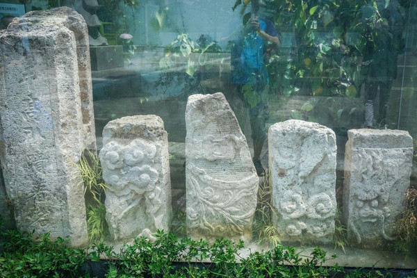 大舜庙的雕刻艺术最著名的是“三雕”——石雕、铜雕和木雕。大家请看,山门广场上的这五块“青石地雕”就是非常典型的石雕作品。这五幅古朴、精美的青石地雕,看似简单,却展示了人类从远古走向汉代的五个不同时期的文化。大舜庙的建筑为秦汉风格,使它更具新颖性和独创性。大舜庙的设计,在秦汉建筑的条石结构基础上,运用了青铜这种现代装饰元素,既突出了远古时代的粗犷古朴,又符合现代人的审美意趣,是一种古代与现代的完美融合。
