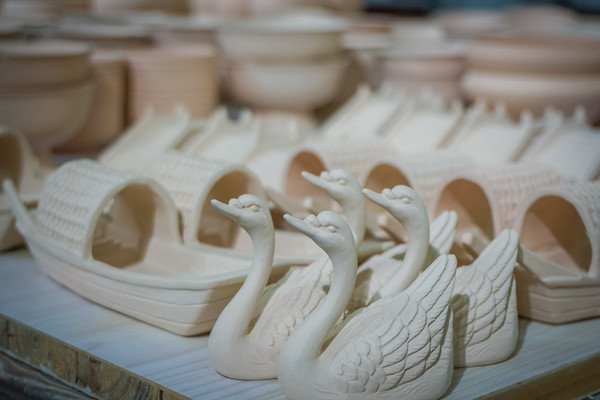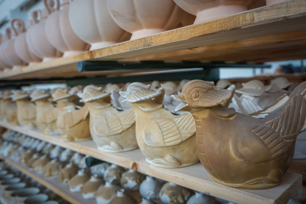 这些天鹅可能就是用来摆筷子的吧。虽然是模子里出来的,但是也做的相当的这让我想起了那首著名的鹅,鹅,鹅,曲项向天歌,白毛浮绿水,红掌拨清波。这些模具是用石膏做的。穿黄衣服的阿姨就在这里工作,是来修毛坯飞边的。