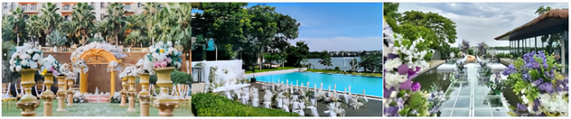左起:上海虹桥西郊庄园丽笙大酒店户外婚礼、武汉联投丽笙酒店户外无边泳池婚礼、中信泰富朱家角锦江酒店水上婚礼