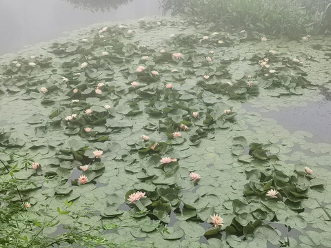 景区大巴乘坐地点在聚龙大酒店的门前,门前有一池塘,开遍粉色荷花,非常好看。