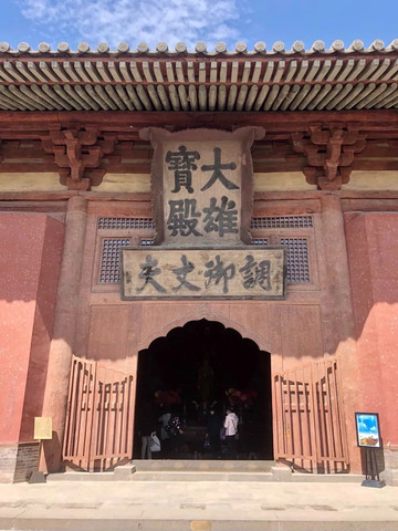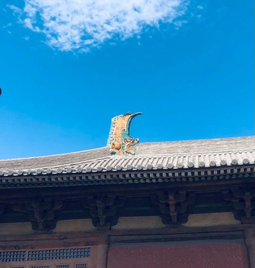 今天到华严寺到跟前了,我简直十脸震惊!我天,怎么会有这么大的寺庙啊!这是皇家佛寺啊!尤其是这主殿大雄宝殿,大概是我国现存最大的佛殿了吧?面积1559平方米,单层,屋檐高9.5米,目测屋顶也有这么高。屋顶上的两个凸起的动物造型,是古建筑中常见的鸱吻。