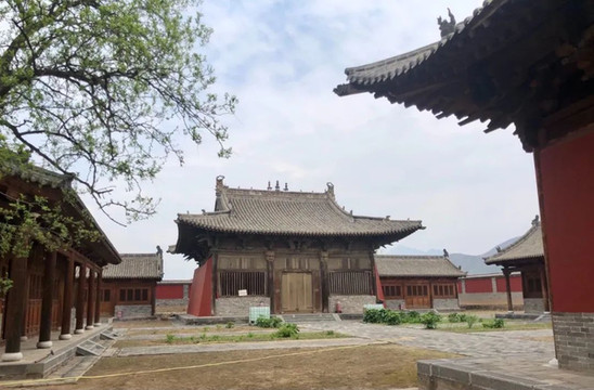 掩映在古树之中的东大殿寺院右边原大殿已损毁。左边,一座俊逸的丹朱色大殿夺入眼球。它飞檐平缓,两端微翘,正门大开,毫无保留地站在你面前。它是文殊殿,竟是一座金代木建!