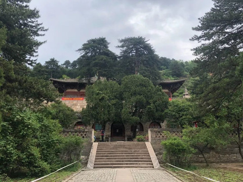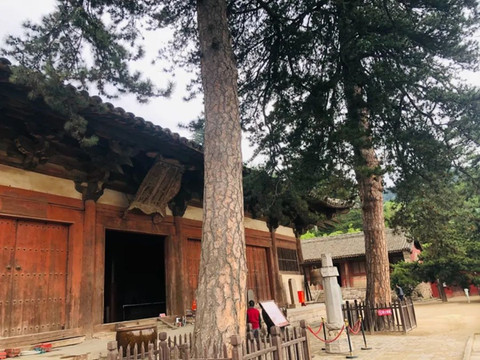 车在道路尽头处停下,前面是棵古松,松旁就是佛光寺照壁,而大殿就在后面。青砖翠松,红墙绿草,一下来就感受到古刹风韵。