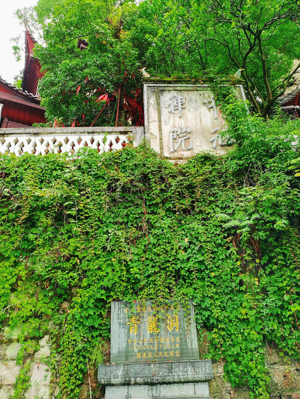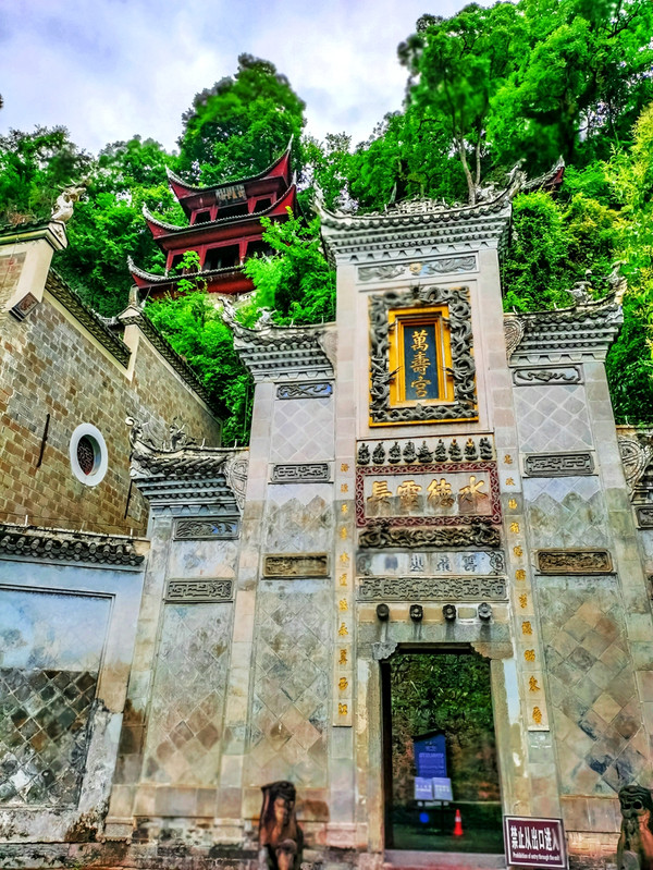 景区以万寿宫为主,各亭台楼阁依山傍水,好似一座悬空寺。远远望去青龙洞的建筑异常的壮观,建筑几乎都是贴在高高的山石上建造起来的,震撼!万寿宫门口上的四字刚劲有力,上面的宗教人像雕刻得栩栩如生。