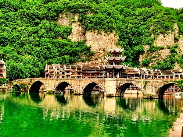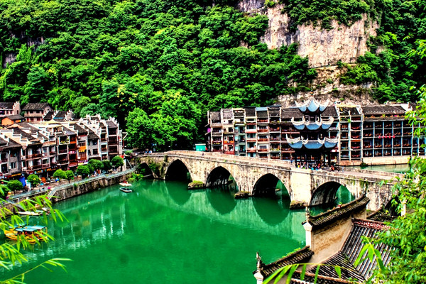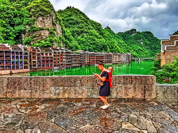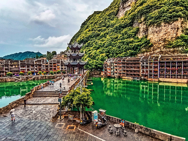 从山上向祝圣桥瞭望。祝圣桥上的魁星阁原是清代建筑,但在1934年战争中毁损,现今的魁星阁是镇远人在1986年重修的。
