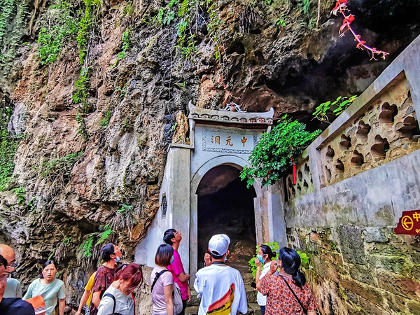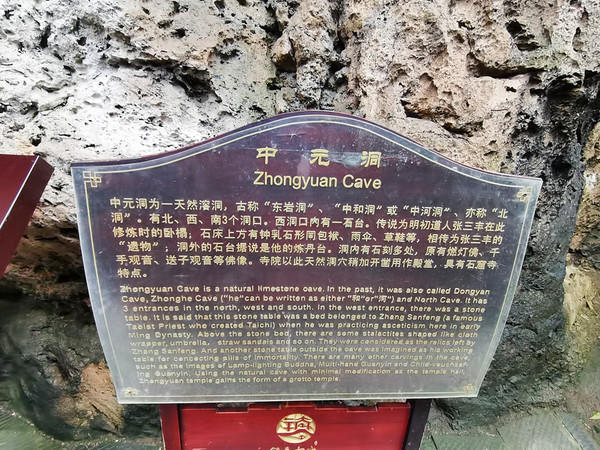 这是中元洞的铭牌,你能清晰地看到它记载的这处历史遗迹的经历。中元洞为一天然溶洞,古称“东岩洞”、“中和洞”或“中河洞”、亦称“北洞”。有北、西、南3个洞口。西洞口内有一石台,传说为明初道人张三丰在此修炼时的卧榻;石床上方有钟乳石形同包袱、雨伞、草鞋等。相传为张三丰的“遗物”,洞外的石台据说是他的炼丹台。洞内有石刻多处,原有燃灯佛、千手观音、送子观音等佛像。寺院以此天然洞穴稍加开凿用作殿堂,具有石窟寺的特点。