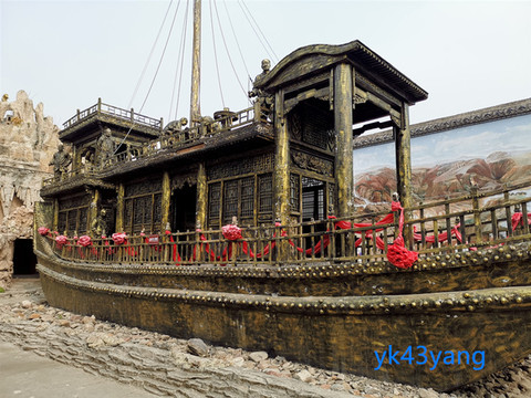进入栈房区,先来到了侧院。院内有一棵古树,还有一艘商船的模型。这艘船可能就是康家船队中最大的航船——太平船。