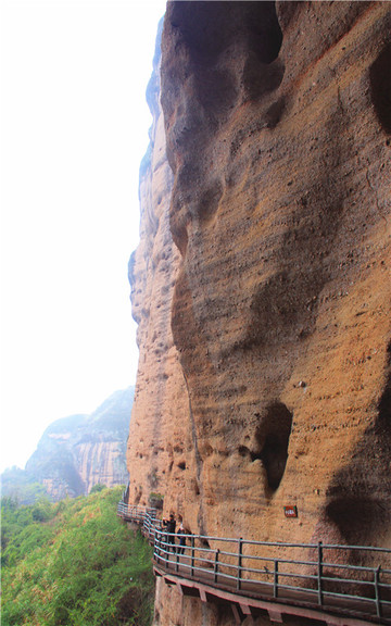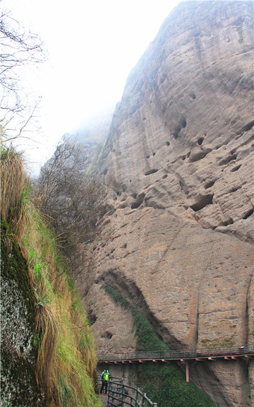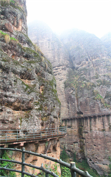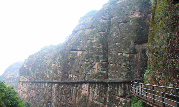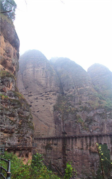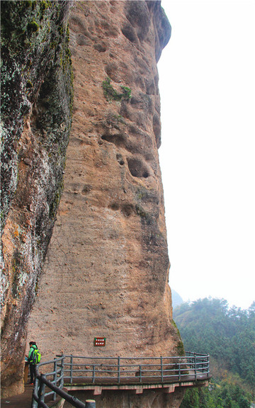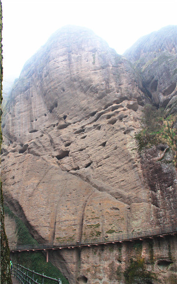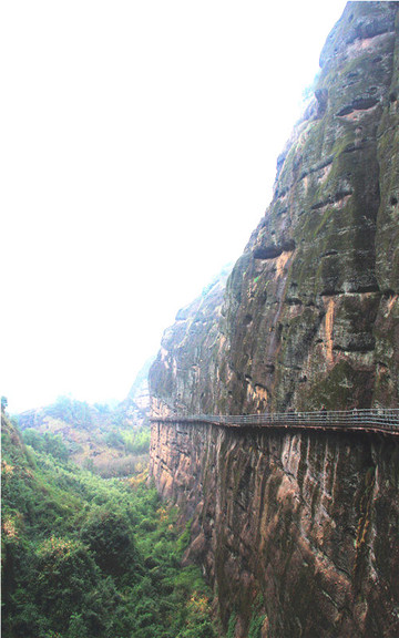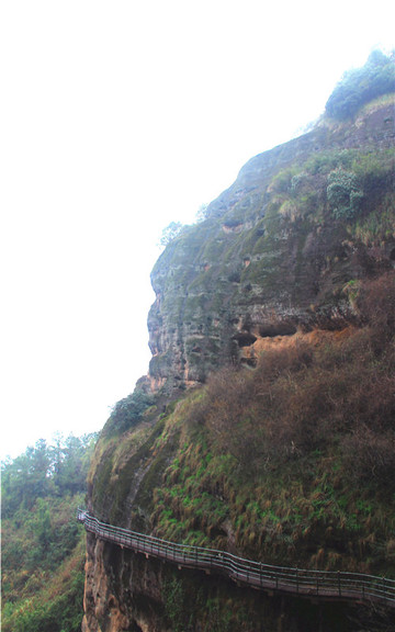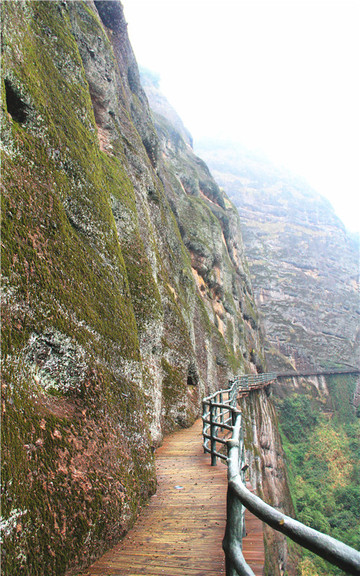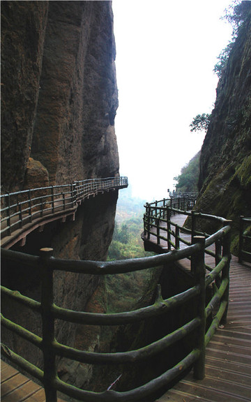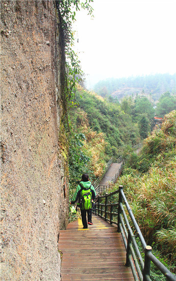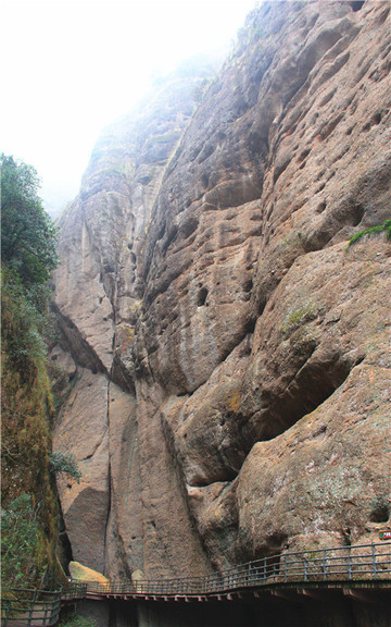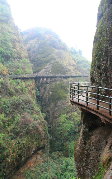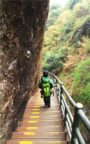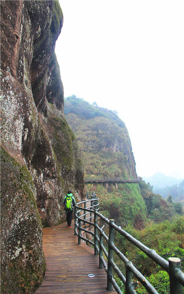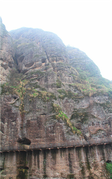 龙虎山的高空栈道实际上并不怎么高,像一条游龙蜿蜒缠绕在悬崖峭壁之上,沿途也比较平缓错落起伏不大。