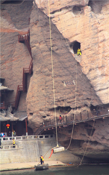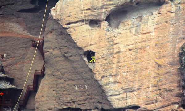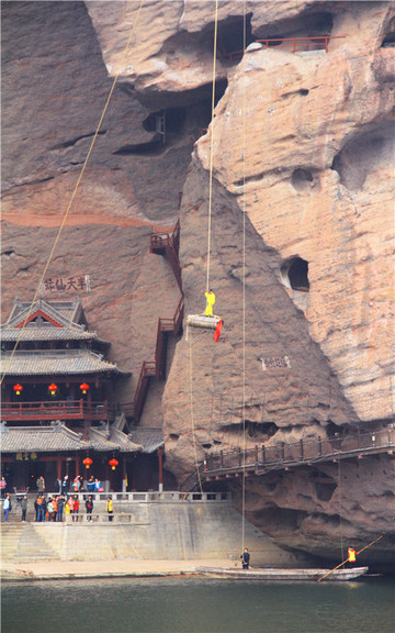 仿古吊装法升置棺木的过程,如今已经在龙虎山展现,并成为龙虎山一个固定表演节目,这个节目就设置在仙水岩悬棺比较集中的飞云阁。