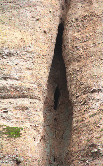 象鼻山是长期受雨水冲刷溶蚀风化而脱落,造成崩塌残余型的石梁穿洞类景观。
