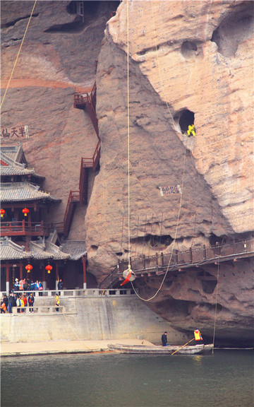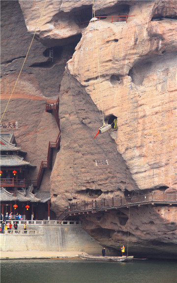 自山顶处燃放一挂鞭炮,祈神灵之保佑,一黄衣表演者自峰顶轻轻腾空跳起,沿着垂直悬挂到江面的绳子攀缘而下,灵活的身躯在空中表演出许多令人惊叹的高难度动作。