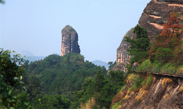 龙虎山因其丹霞地貌,以是千姿百态,形成为了各种异景。特别是“金枪峰”,可谓绝景,它位于天鹅湖东,高112米,石峰直插平畴,平地凸起,有孤柱擎天之状,呈男性阳刚之美。