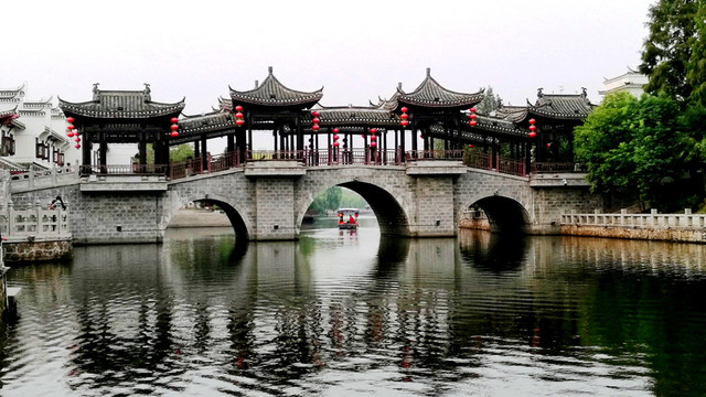 三河古镇,古名鹊渚、鹊尾(渚)、鹊岸,是中国历史文化名镇,国家5A级旅游景区。镇内以古巷、古街、古桥、古城墙、古庙、古炮台、古民宅、古茶楼闻名。主要景点有三县桥、望月桥、鹊渚廊桥、万年台、忠武阁、英王府等历史遗迹,也是庐剧的发源地。