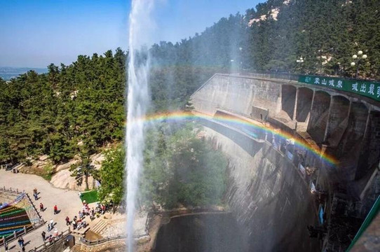 还有蒙山彩虹喊泉,喷出的水柱近50米的极限高度,当阳光照射到半空中的水点,光线被折射及反射,在九龙潭坝上形成拱形的七彩的光谱,浪漫而又神奇。