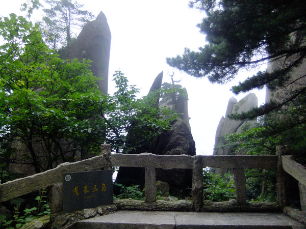 蓬莱三岛:三座参差不齐的小石峰相拥而立。峰巅似剑,纯石无上,峰上奇松挺拔,形态各异。每当云雾缭绕,峰尖微露,似海中岛屿,人们又喻为神话中的蓬莱仙境,故取名“蓬莱三岛”。
