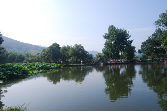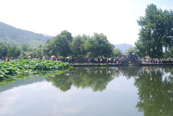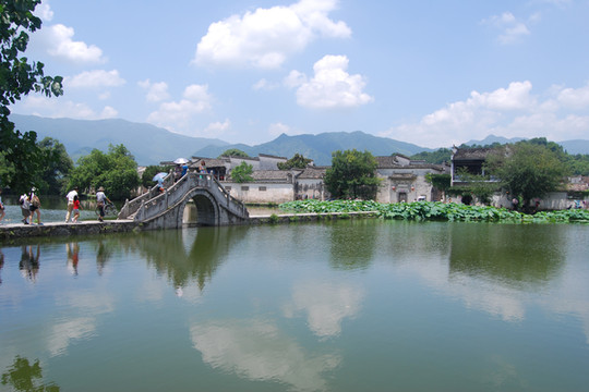 南湖位于宏村南端,建于明朝距今已有400多年历史,开阔的水面呈弓形,穿湖而过的画桥是电影《卧虎藏龙》里李慕白牵马走过的地方