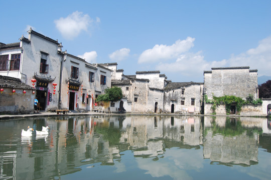 宏村 因“扩而成太乙象,故而美曰弘村,清乾隆年间更名为宏村。是古黟桃花源里一座奇特的牛形古村落。是徽派古村中的代表,有“中国画里乡村”的美誉。一是看水利系统带来的水景,南湖、月沼是精华所在;二是看建筑上的徽派三雕,砖雕、石雕、木雕,像剪纸一样精细,人文景观与自然景观很好地融为一体