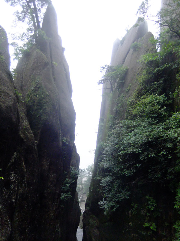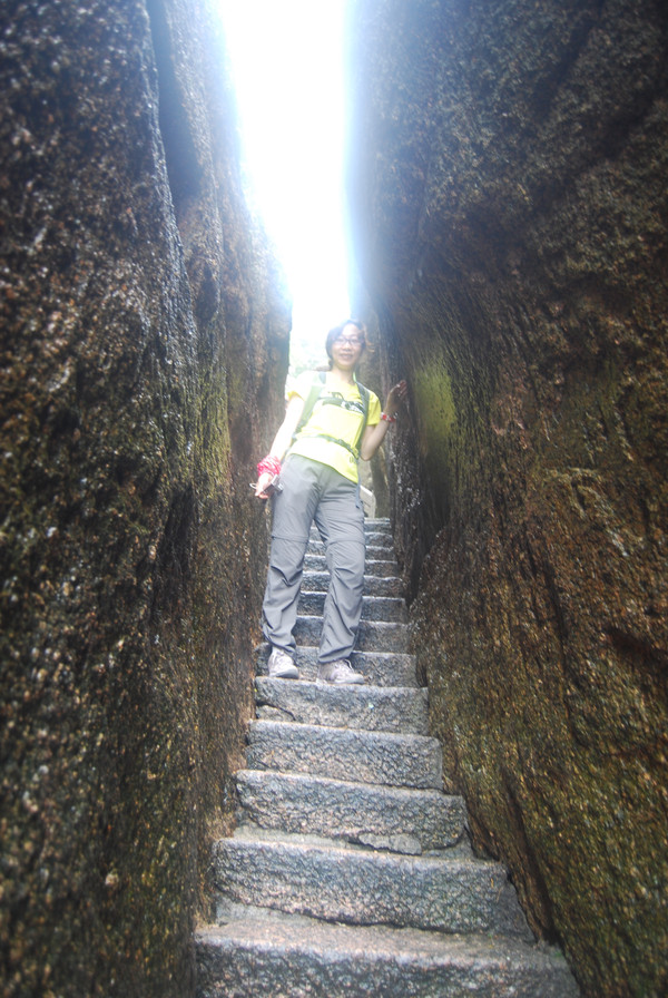 黄山一线天:一道两壁夹成的狭长石巷,宽处不过2米,窄处仅0.5米,中间盘道有80多级,只能容一人通过。人行其中,仰望长空,蓝天仅存一线,若非子、午,不见月、日,故名。