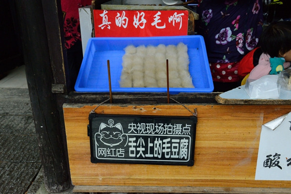 这时看到有人卖鸭腿,肚子也饿了,花10元钱买了1个试试,味道不错。进到村子又见到《舌尖上中国》介绍的“毛豆腐”,要了5元,味道就象我们南方的腐乳,但没有那么咸,味道不怎样好。