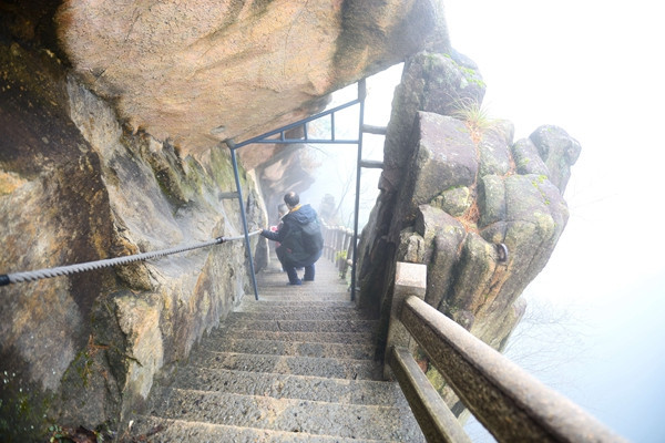 从鳌鱼洞出来,虽然是下山,石阶却是山体开凿出来的,十分陡峭,下面就是万丈深渊,人必须紧紧抓住安全绳,否则掉下去连渣都找不到。如果遇到对面来人很难让,必须等其中一人缓慢通过后,另一人才能过去。