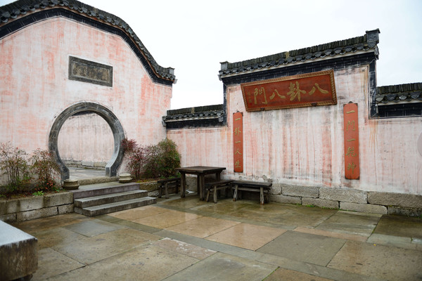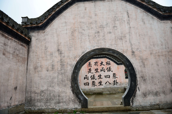 放好行李,我就出去遛遛。沿着一条小河流5分钟就走到景点大门。从外看,景区有条清澈小河呈“S”型穿村而过,就象八卦图中分界线。明清古建筑群倒影水中,非常漂亮。村子周边分布着八座山,自然形成了八卦的八个方位,共同构成了天然八卦布局。