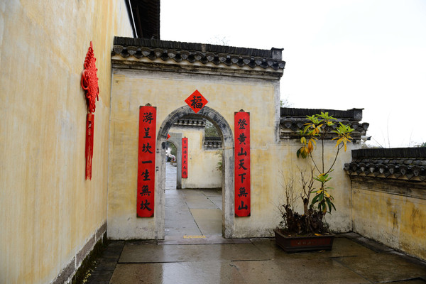 拍完照,经过一个门口,两边有副对联,上联:登黄山天下无山,下联:游呈坎一生无坎。没见横批。