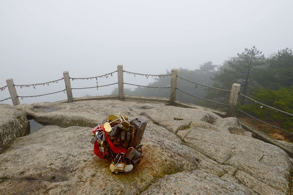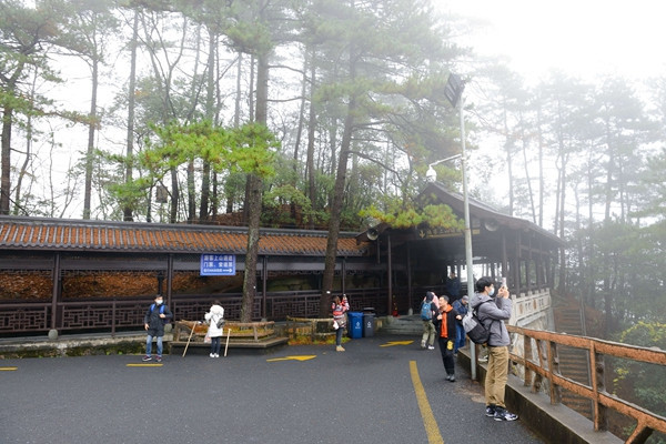 年轻人晚上住山上,我要赶回山下,线路不同,我们就分开了。我往左边路口走,过了白鹅山庄,从西海来到排云亭。雾气越来越大,灰蒙蒙一片,很难分清东西南北,更不要说看景了。雾水逐渐变成了颗颗雨水,汗水雨水从头顶湿到脚,又冷又热又饿,十分难受。