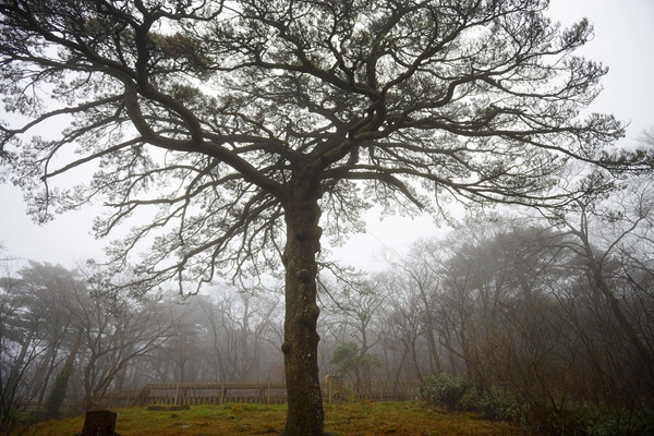 2个半小时后(一般人3个小时),我俩终于爬到了白鹅岭(索道出口)。又走了500米来到一个三叉路口。我们问了从下面上来的人是什么地方,他们说是黑虎松。我们一抬头,一棵黑色的松树,枝条张牙舞爪,真像条黑色的老虎随时扑来。