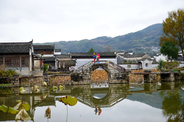 村前又是一月牙形池塘(同宏村相似),塘里残荷片片,两座古桥横跨池塘,构成一幅美丽水墨画。