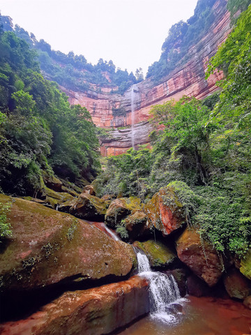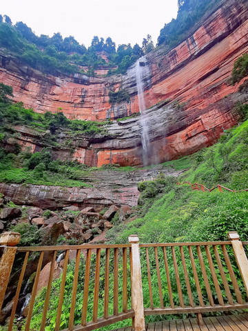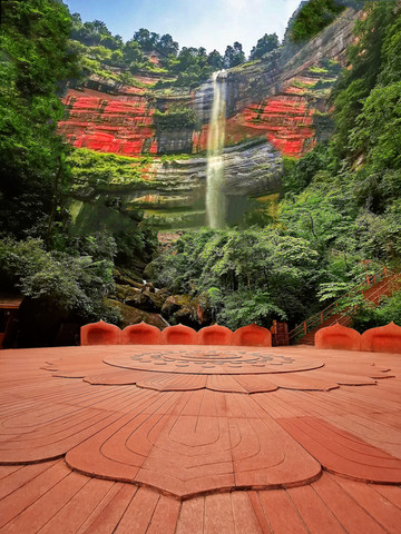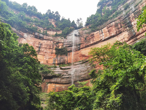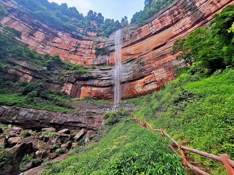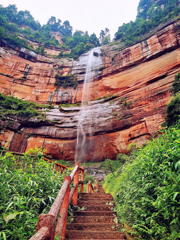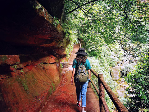 下午的佛光岩依然是游客稀少,以至于往返乘坐观光车都享受着难得的包车待遇,简直是如入无人之境,下车后我们沿着栈道向佛光岩进发,登山难度不算很大,约莫半小时光景,循着瀑布水声,就可以到达莲花座观景台,当然也可以继续登至离瀑布几乎零距离的最高观景台,与飞瀑来个亲密接触。佛光岩早在侏罗纪、白垩纪时代就已形成,像是恐龙灭绝前夕用生命和鲜血书写的一部朱红色无字天书,摊开在半天云海中,一泓飞瀑飞流直下,画面震撼,犹如赤云中飞身而下的小白龙,飘逸俊洒。