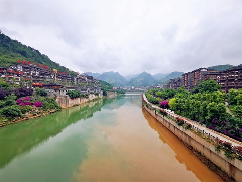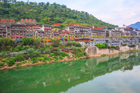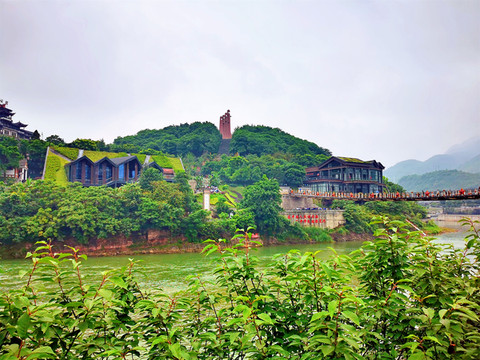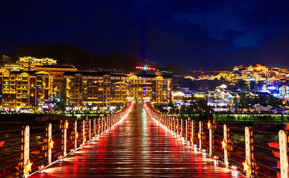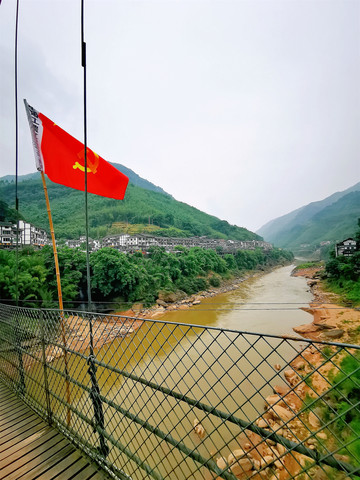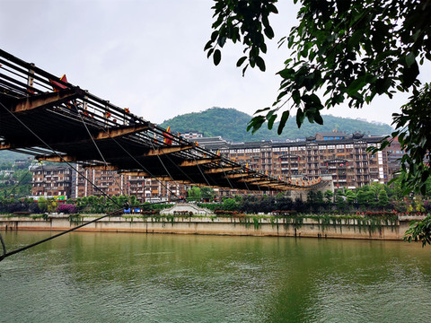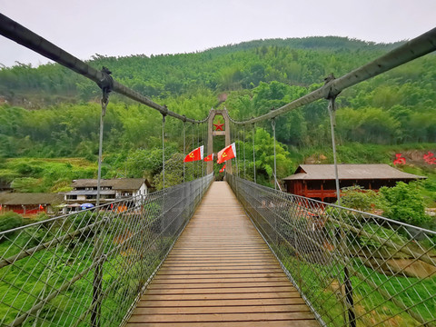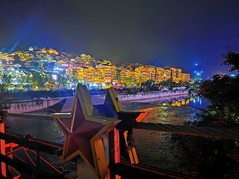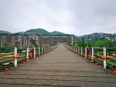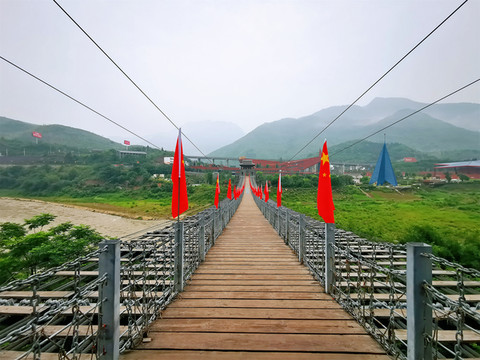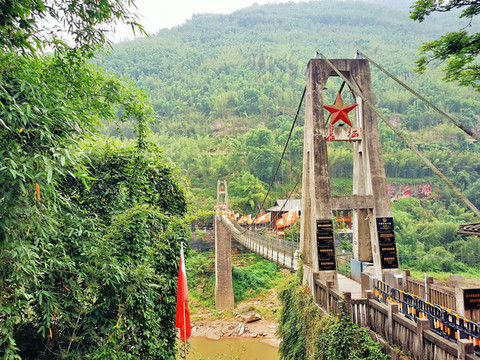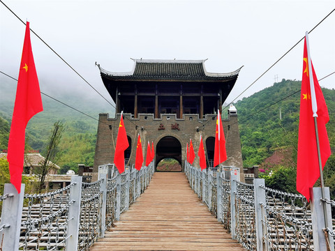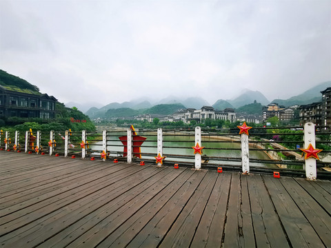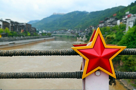 清晨漫步在土城古镇赤水河边,沿着红色骑行道走向铁索桥,吱呀作响、摇摇晃晃的铁索桥上空无一人,我独自享受着此刻的宁静,脑海中却浮现出昔日红军一渡赤水河的惊险画面,1935年中国工农红军长征到达土城,开始了青杠坡阻击战,战斗十分惨烈,最后在此挥师一渡赤水河,揭开了红军“四渡赤水”的光辉篇章,全长193.5米的浮桥,代表着1935年那段艰辛的峥嵘岁月。站在桥上眺望土城,云雾缭绕中土城宛如一座世外桃源,远离世事喧嚣,吊桥对面就是贵州最大的“五角星”建筑综合体——红星照耀艺术综合体,悬挂半空的“五角星”,震撼人心,引人注目,像似星火燎原中革命的曙光。