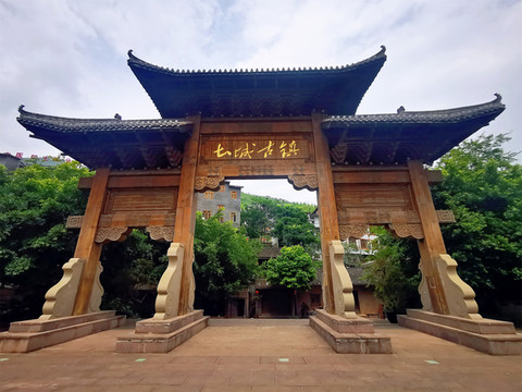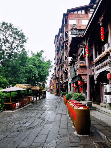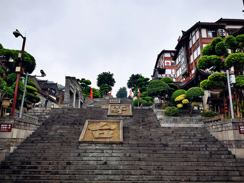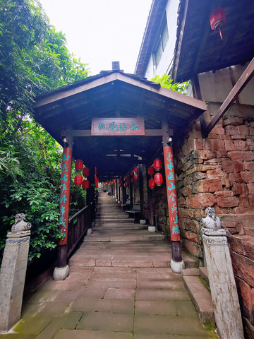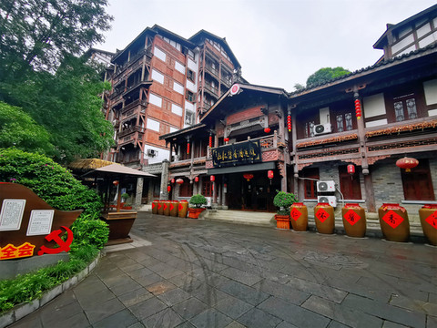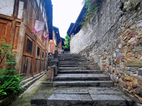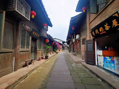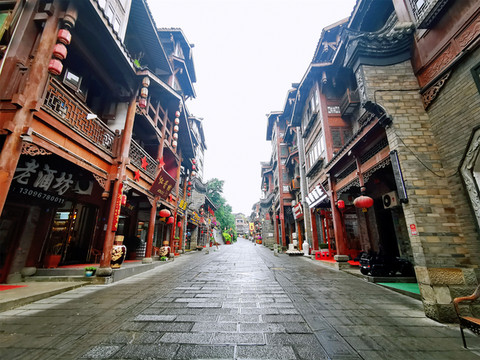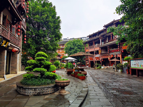 土城是展现十八帮文化和红色文化的一张名片,连路面都被漆成耀眼的红色,走进古镇,街巷多为青石板铺砌,以黑色木楼为主的古镇依山傍水,建筑风格高低错落,随地形起伏,构成古镇鲜明独特的山城风貌,历经数百年风雨的民居仍保留着“前店后宅”的格局,道路两旁的店铺门前巾旗摇曳,上面分别写着袍哥、盐帮、马帮、铁帮、糖食帮、茶帮、丐帮、布帮、戏帮、经纪帮、栈房帮、米帮、药帮、油帮、酒帮、石帮、木帮、船帮,共有“十八帮”之多,帮帮都有自己的江湖传奇,被岁月磨砺的光滑而凹凸不平的石板路,向我们诉说着石板街过去的繁华。