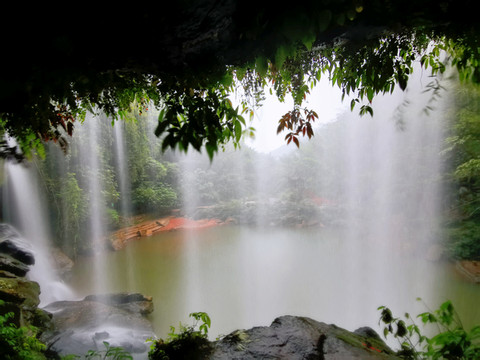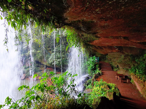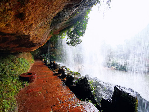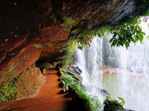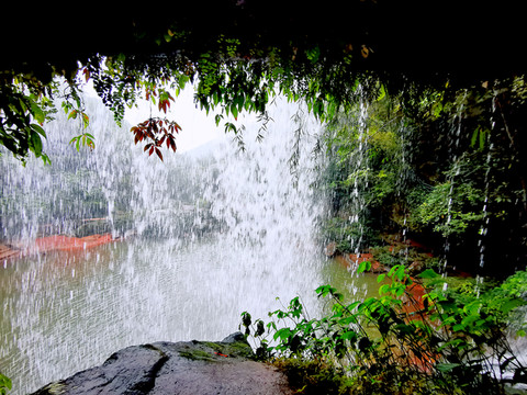 第一级瀑布——水帘洞瀑布却是我四洞沟最爱之处,站在瀑布水帘后别有洞天,透过珠帘看世界是一种奇妙的视觉感受。瀑布水帘后是一贯穿瀑布两端、三面为石、一面为水的横向窟穴,一条石板小径随洞穴曲折蜿蜒,最矮处必须低头弯腰才能通过,瀑布像帘子一样把石穴长廊遮盖的严严实实,不易被人发现,走进洞穴,顿感清凉无比,崖上植物如绿色帐幔轻垂曼摆,白色珠帘,银珠万点,还可以直接把手伸出去,与瀑布来一次难得的亲密体验,藏在瀑布背后,忍不住想要大声吼上几嗓子,与瀑布轰鸣声来个合奏,彻底的放纵自己。
