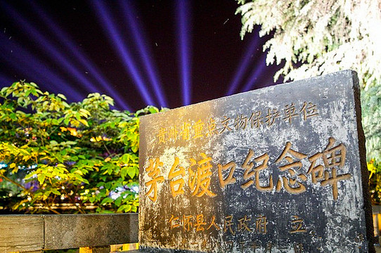 赤水渡口红星铁索桥横跨在绿悠悠的赤水河上,这就是当年红军四渡赤水的地方,桥身很宽,铺着木板,两边的钢索栏杆装饰着红色五角星彩灯,山顶上,松柏茂盛,一座赤红色的纪念碑赫然在目,那便是红军四渡赤水的纪念塔,也是茅台镇的一个制高点,站在那,可以俯瞰整个茅台镇。