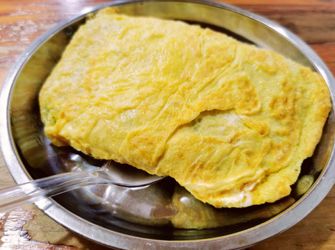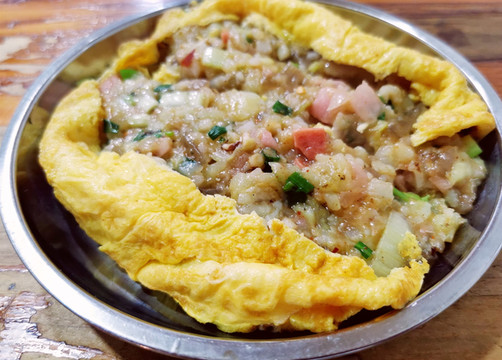 蛋裹辉煌这个名字,听起来非常霸气,其实就是跟蛋包饭有着异曲同工之妙的蛋包洋芋,现摊的鸡蛋嫩滑无比,包上洋芋泥、辣椒、酸萝卜、折耳根,还有遵义人分外热爱的糯米饭,料足味美,金黄的蛋皮,酥软的土豆,酸爽的泡菜,闻之清新淡雅,入口久留弥香。