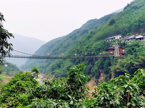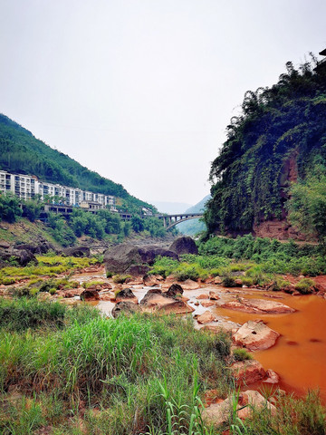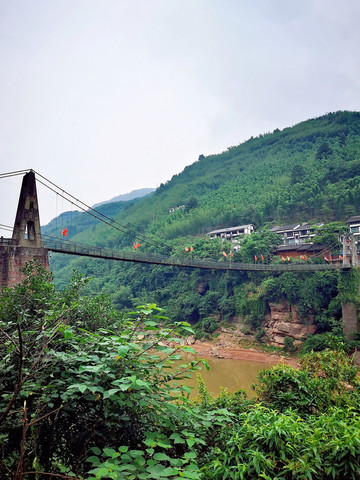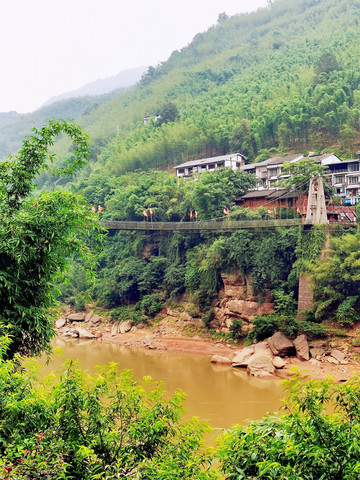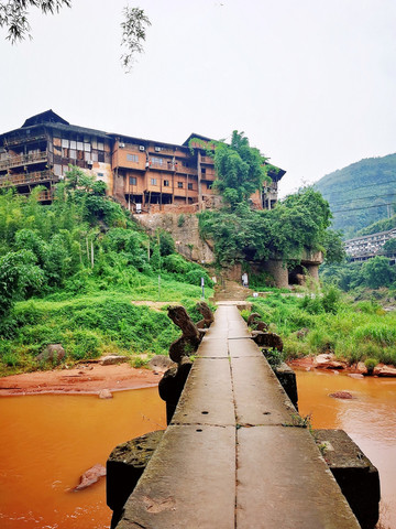红军桥,悬挂在两岸的悬崖之上,看上去十分凶险,红军的标志在正中间闪闪发亮,诉说着昔日的故事,从这看悬崖对面的建筑,古镇整个主建筑群都是建造在河滩的岩石上,因此也被称为大石头上的一座城,沿着赤水河的商铺都是利用木料撑、挑、架来固定悬空在外的吊脚楼,参差不齐,错落有致,看似岌岌可危,虽历经百年风霜,仍然稳如磐石,千百年来承载风雨,就像一颗明珠镶嵌在赤水河畔,时光流转,赤水河早已洗去丙安古镇昔日的铅华,往昔的繁荣渐趋平淡和宁静。